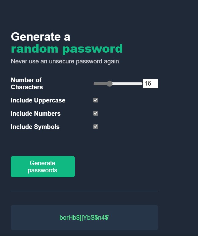 This password generator is meant to help those that can never decide on a good password. There are multiple options to choose from with this password generator. I wanted to include length choice, symbols, numbers and characters. I used Math.random to create random characters. I used GitHub to deploy my site and it deployed without the styles so the images below are an accurate display of the app